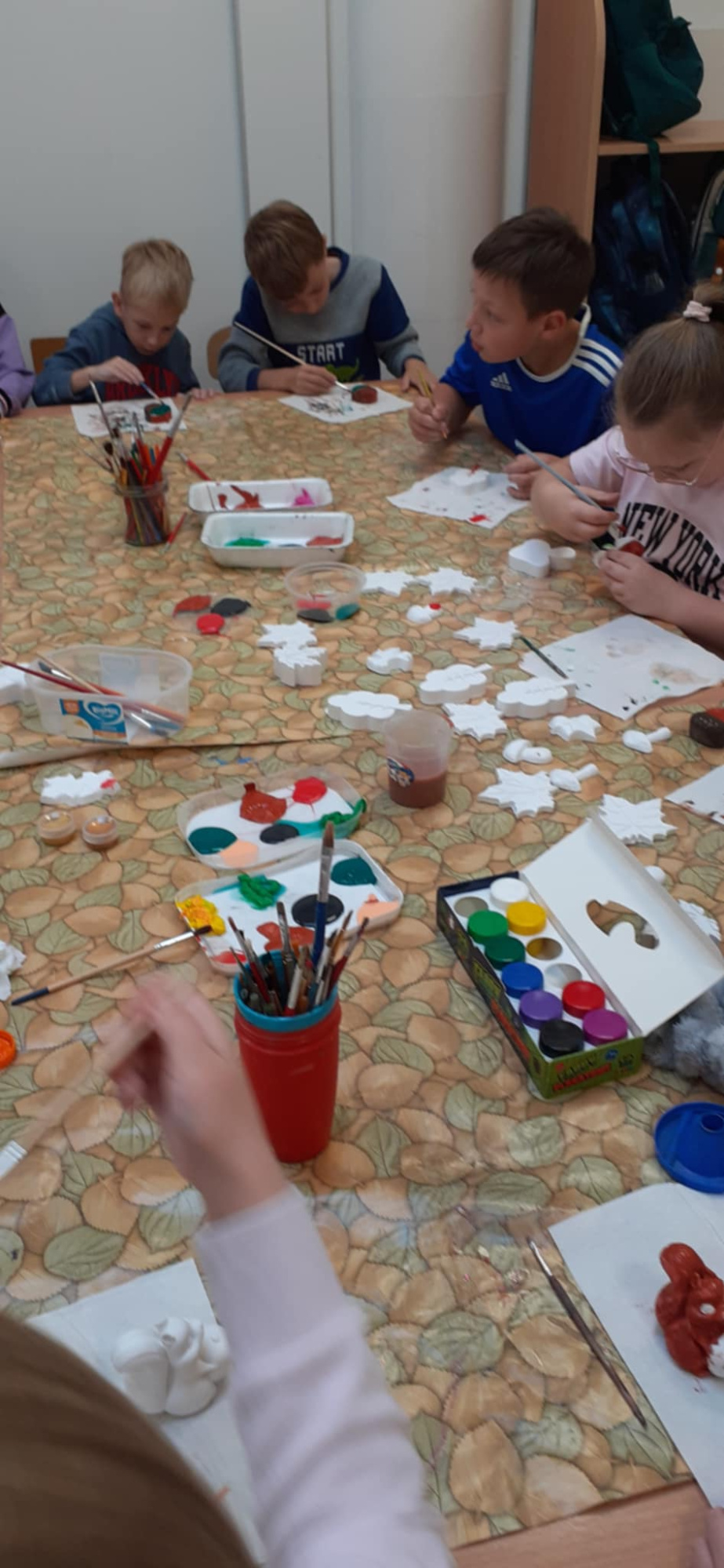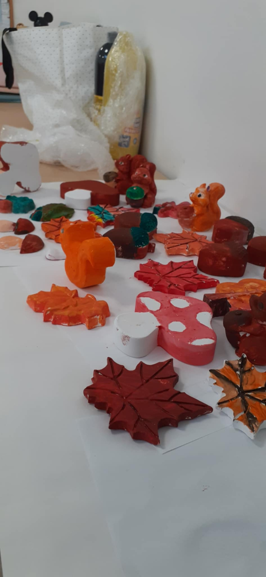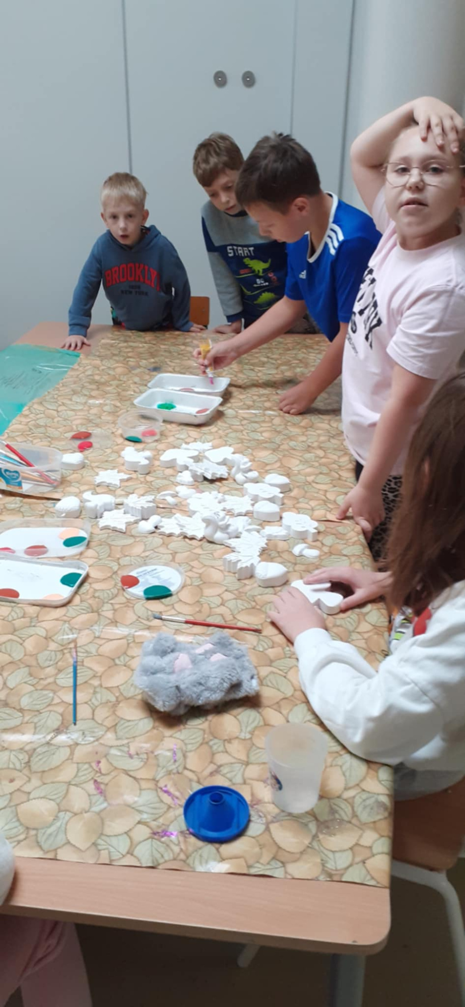 Na początku zajęć uczestnicy mieli okazję porozmawiać o jesiennych barwach i obejrzeć przygotowane odlewy. Następnie, przy użyciu kolorowych farb, każde dziecko przystąpiło do twórczej pracy, nadając gipsowym formom niepowtarzalny wygląd.