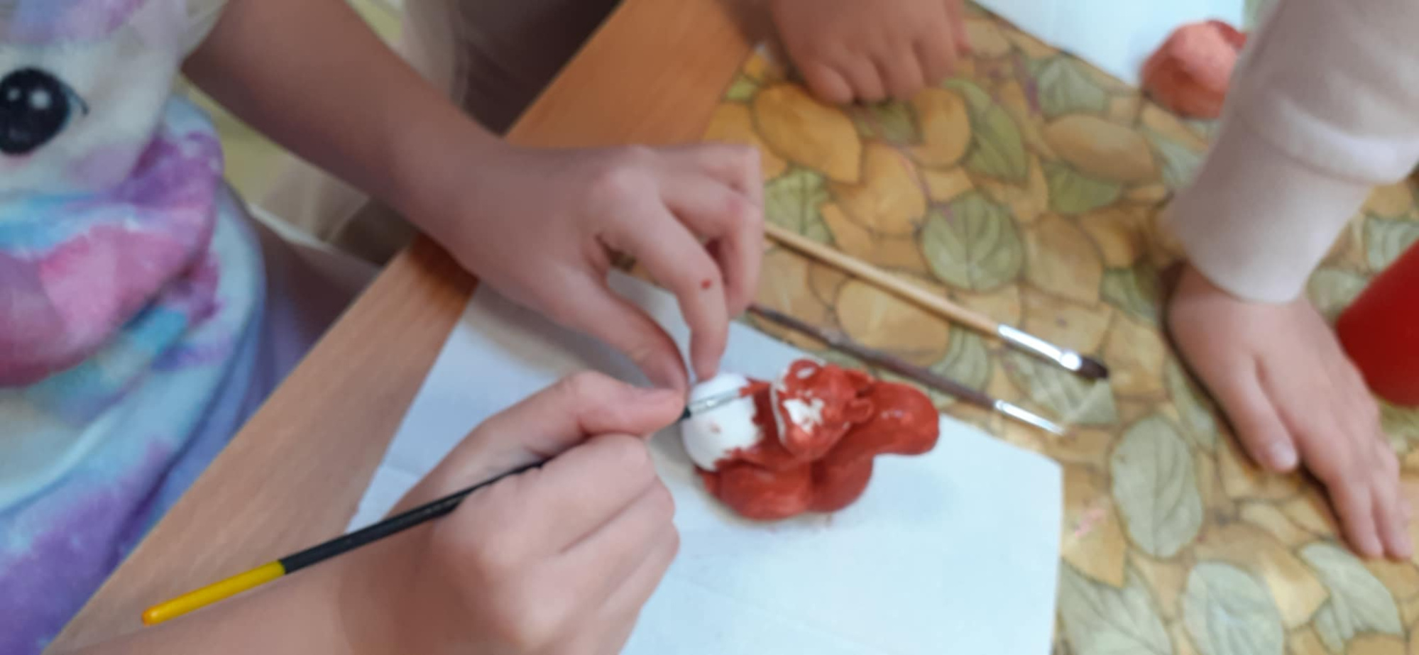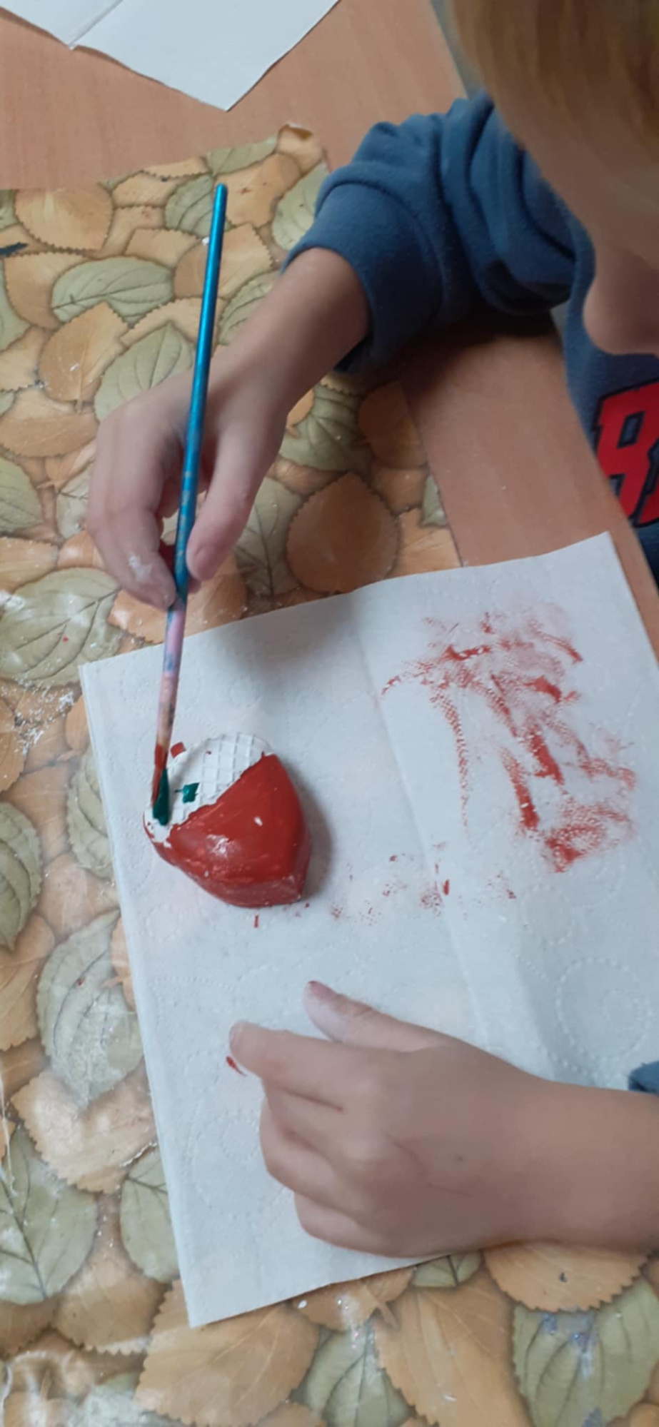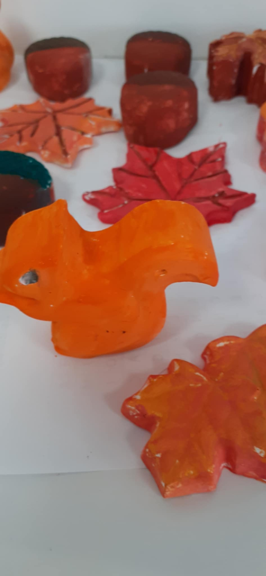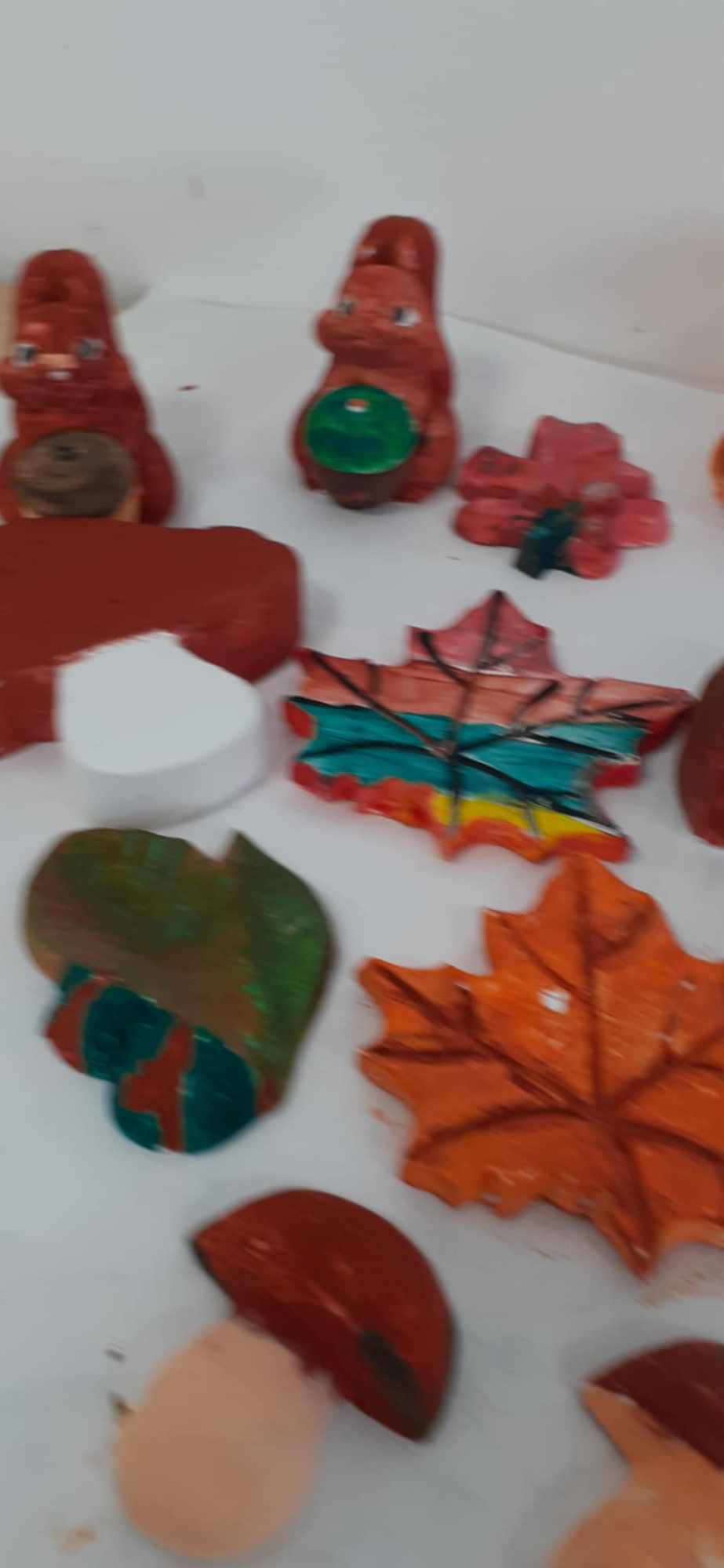 Na początku zajęć uczestnicy mieli okazję porozmawiać o jesiennych barwach i obejrzeć przygotowane odlewy. Następnie, przy użyciu kolorowych farb, każde dziecko przystąpiło do twórczej pracy, nadając gipsowym formom niepowtarzalny wygląd.