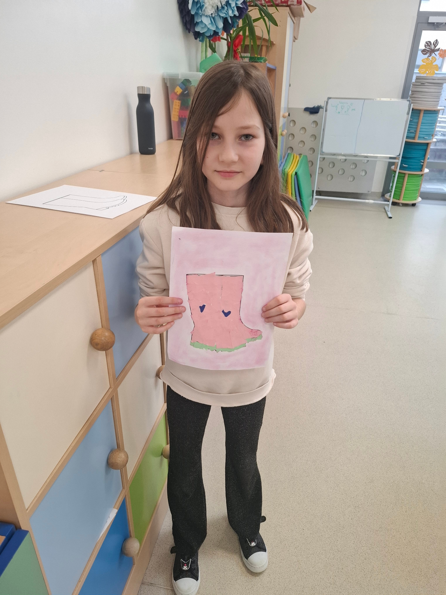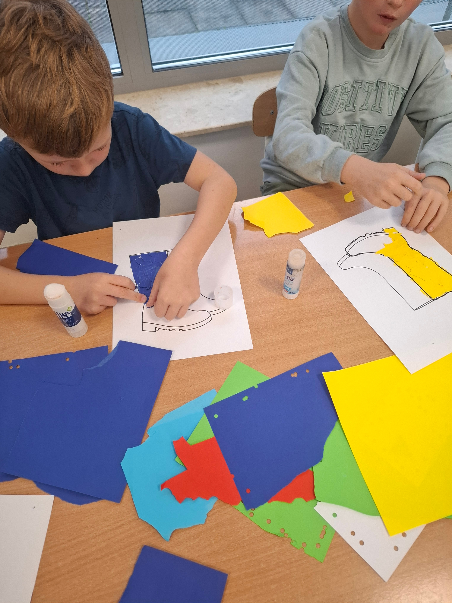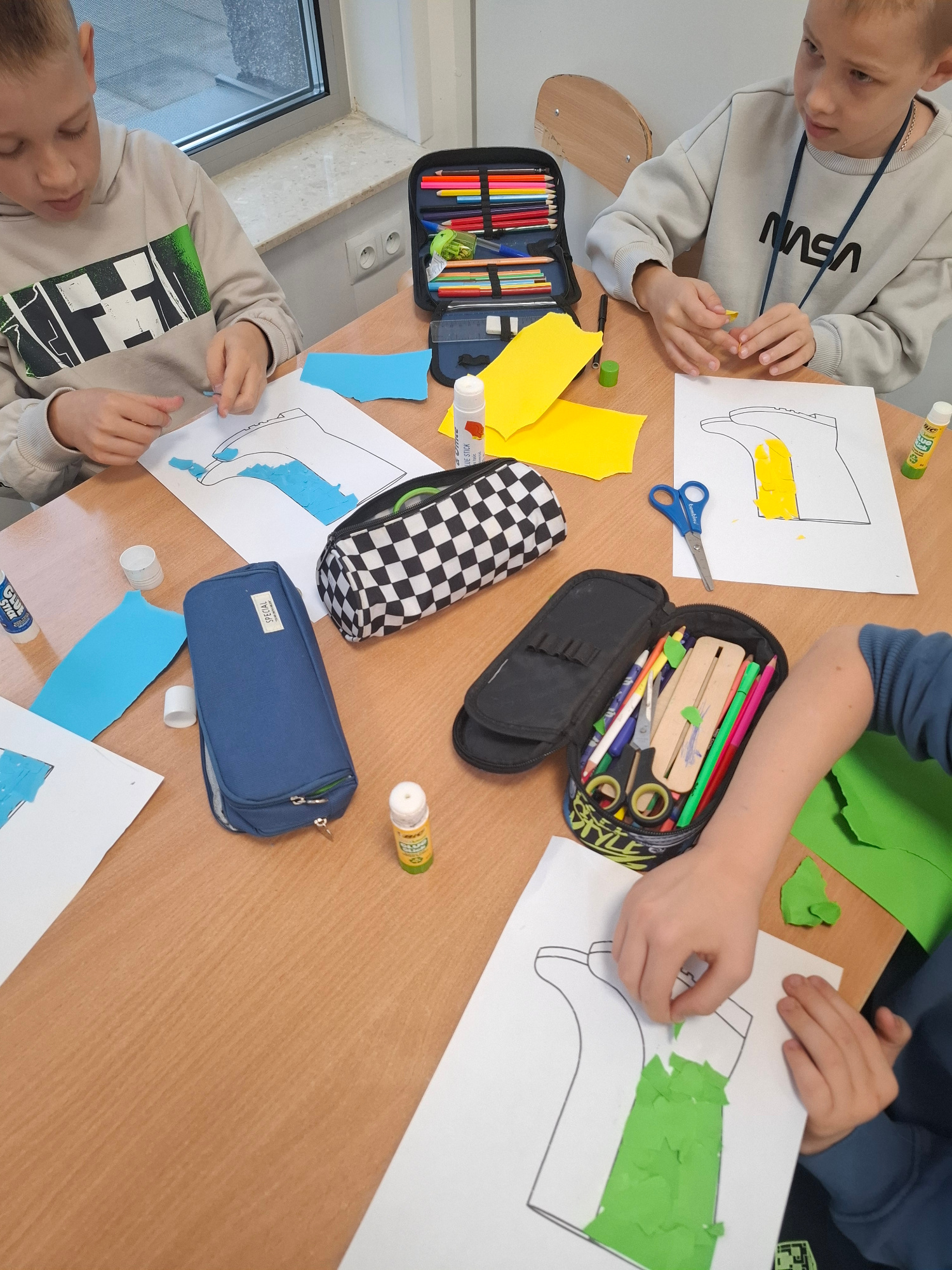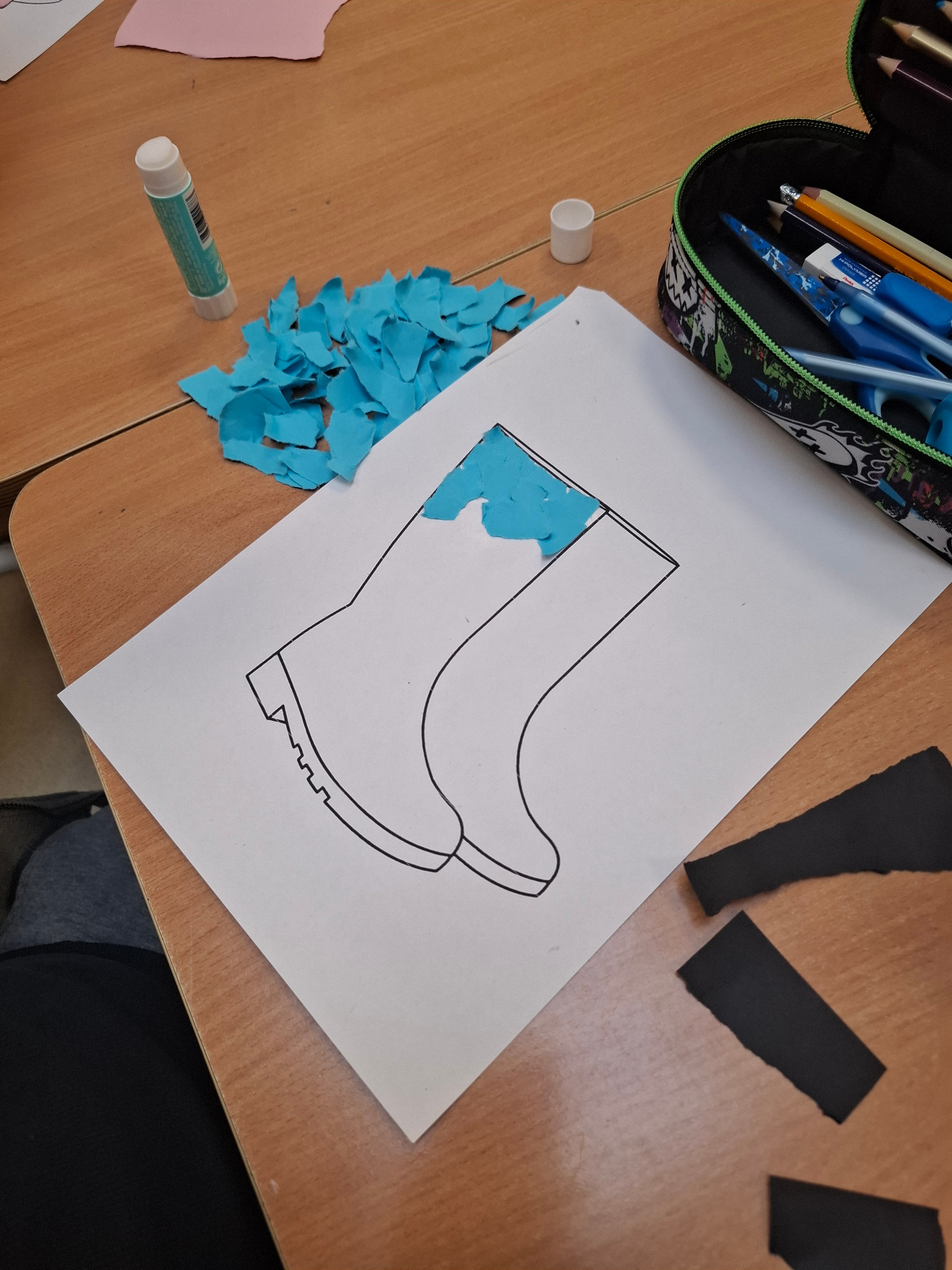 Zajęcia rozpoczęliśmy od krótkiej rozmowy na temat jesiennej pogody i tego, jak się wtedy ubieramy. Uczniowie chętnie opowiadali o swoich kaloszach i deszczowych spacerach. Następnie każdy otrzymał szablon butów, który należało wypełnić techniką wydzieranki. Dzieci z zapałem darły kolorowe papiery na drobne kawałki i przyklejały je, tworząc różnobarwne i wzorzyste kalosze.