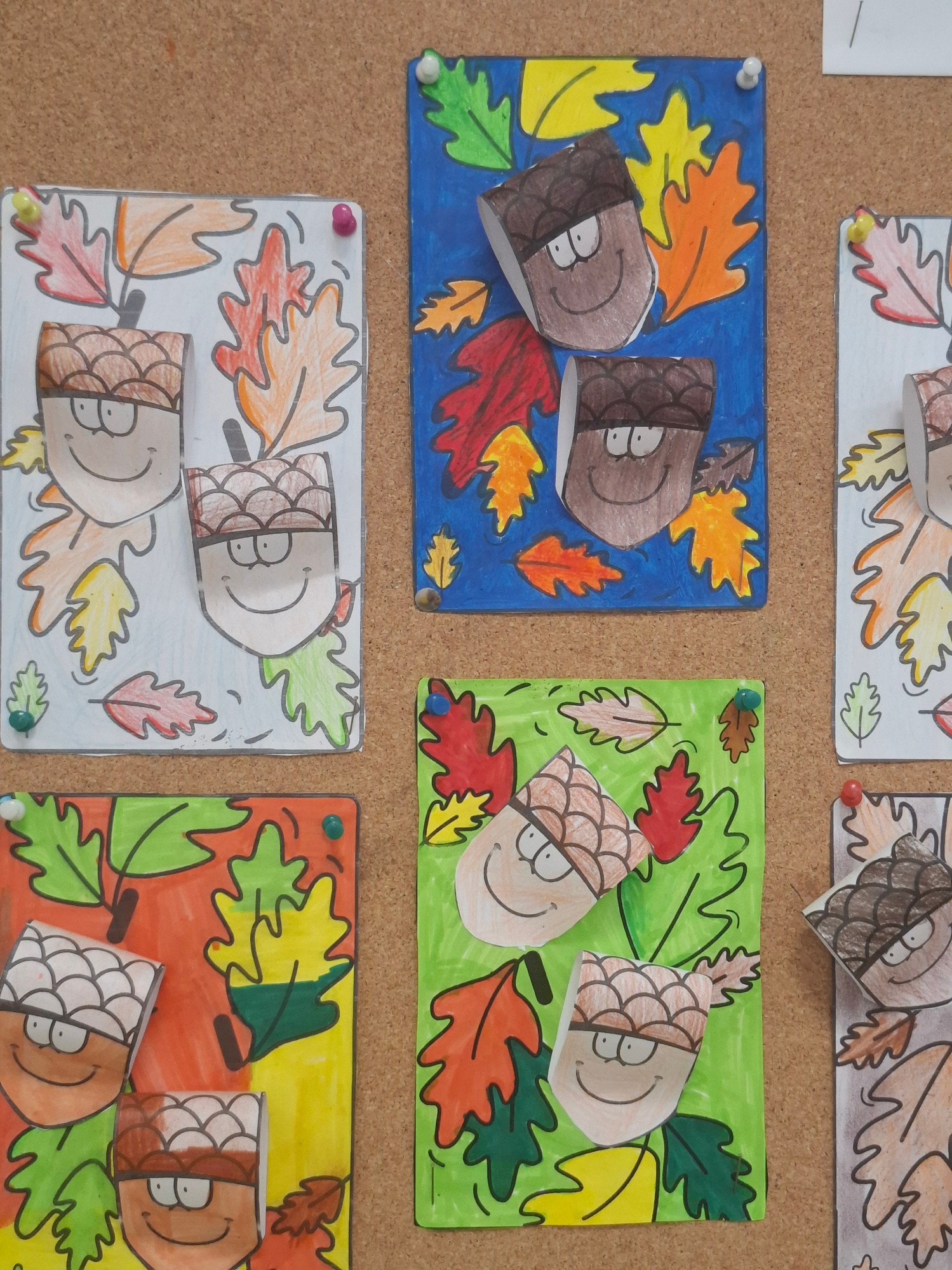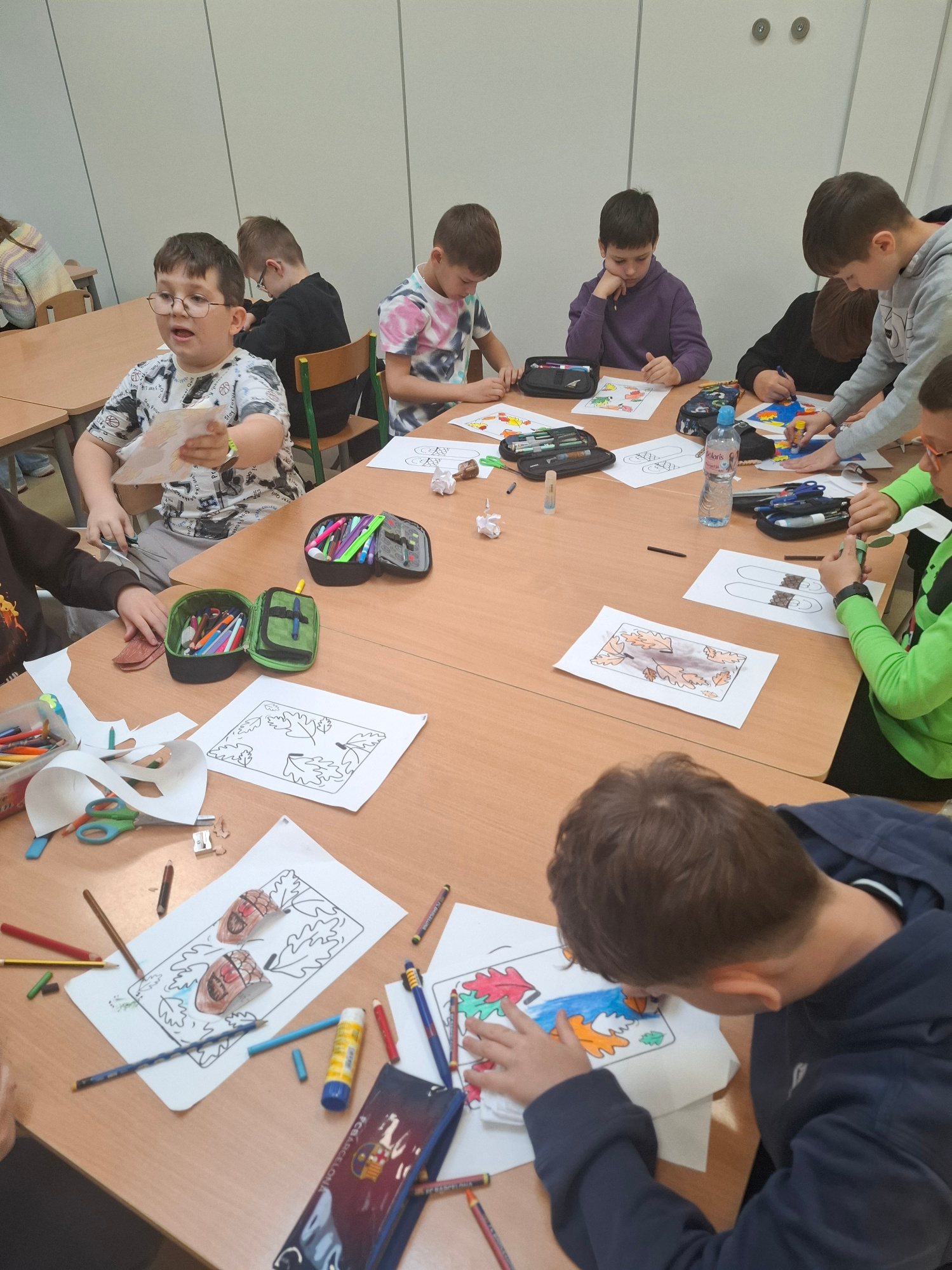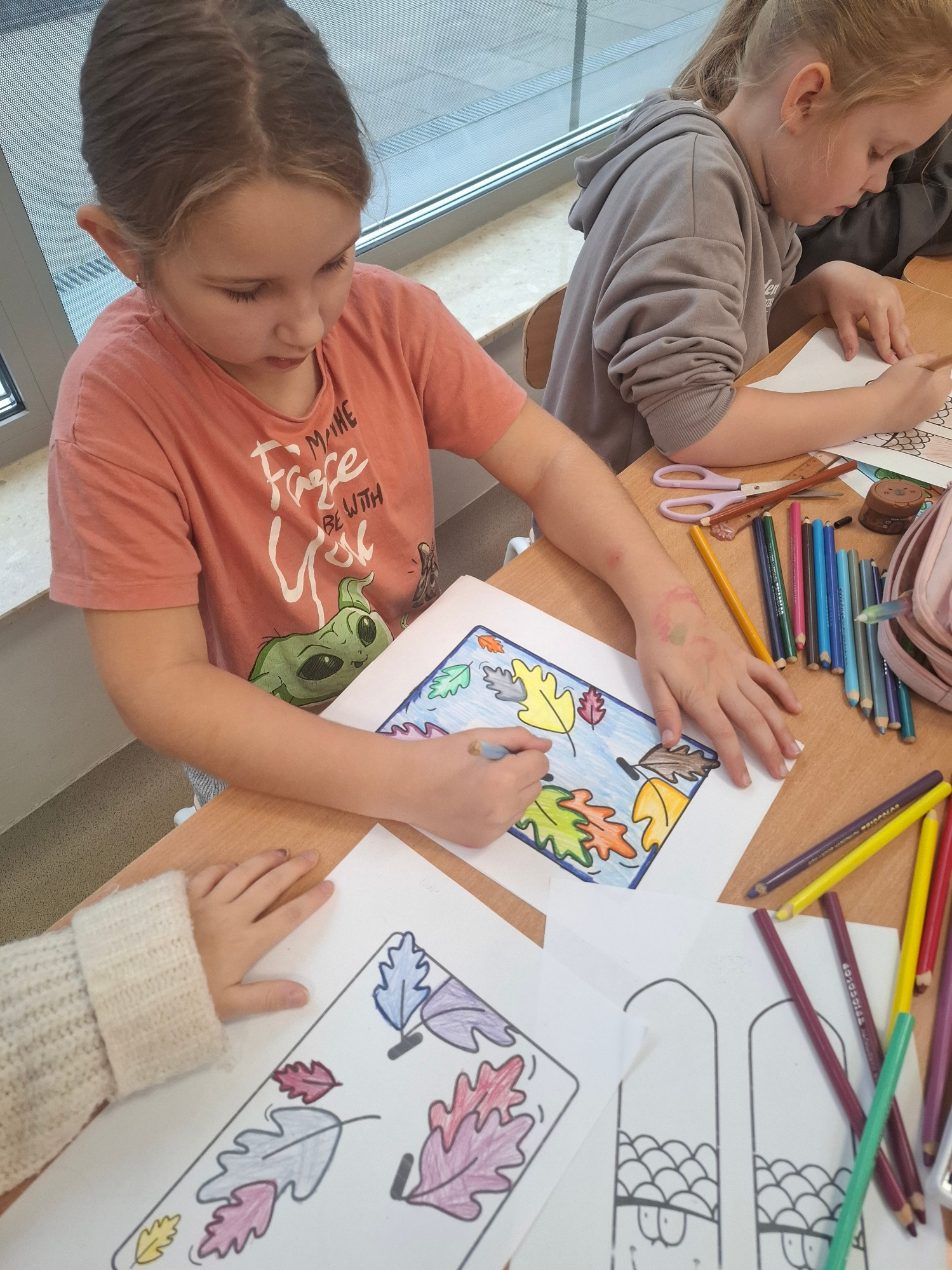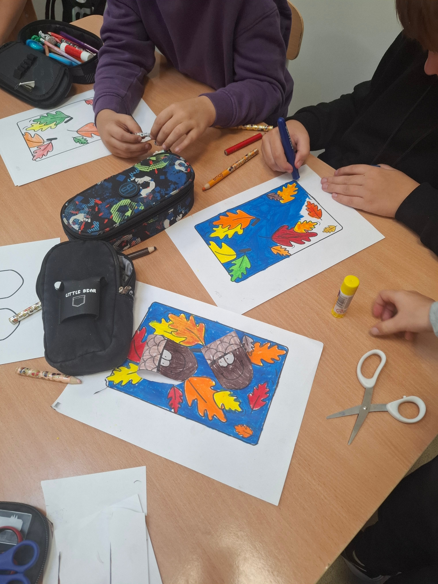 W tym tygodniu podczas zajęć w świetlicy szkolnej dzieci wykonały jesienną pracę plastyczną pt. „Żołędzie”. Zajęcia rozpoczęły się od krótkiej rozmowy na temat jesieni oraz roli żołędzi w przyrodzie. Następnie uczniowie przystąpili do twórczej części zadania – kolorowali przygotowane wzory żołędzi, starając się dobrać odpowiednie barwy kojarzące się z jesienią.