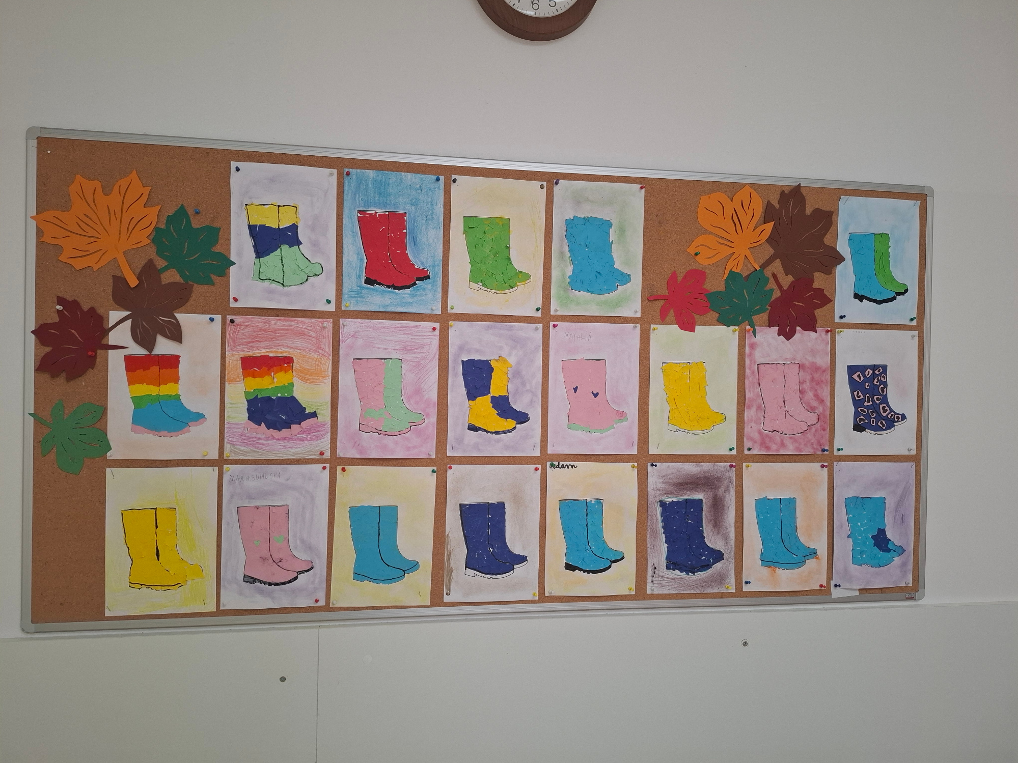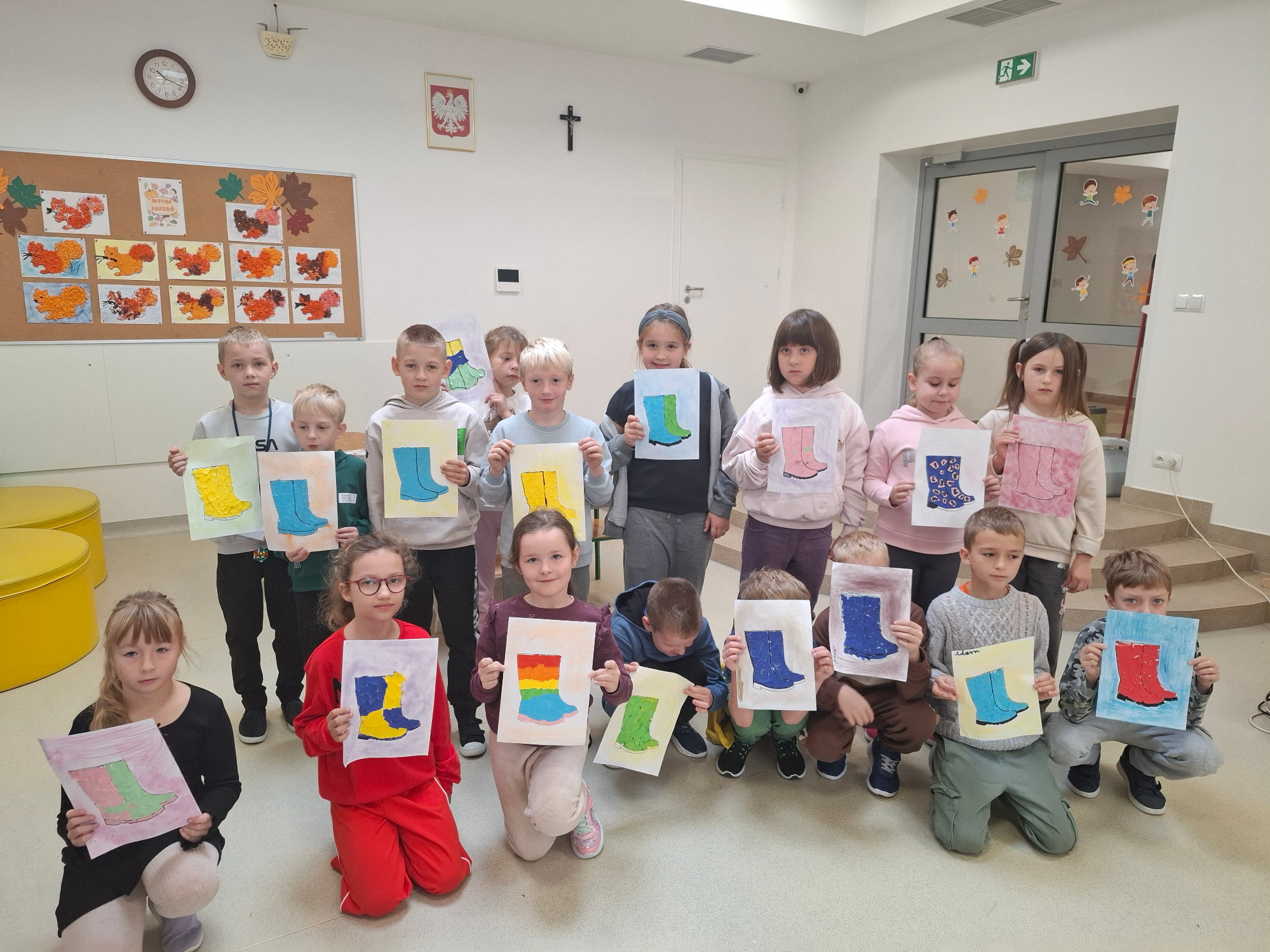 Jesienna pogoda zainspirowała nas do wykonania ciekawej pracy plastycznej w świetlicy szkolnej. Tematem zajęć były kolorowe kalosze, które nie tylko chronią przed deszczem, ale mogą też być świetnym pretekstem do rozwijania kreatywności. Dzieci wykonały wydzieranki z kolorowego papieru, tworząc własne, niepowtarzalne wzory obuwia idealnego na pluchę.