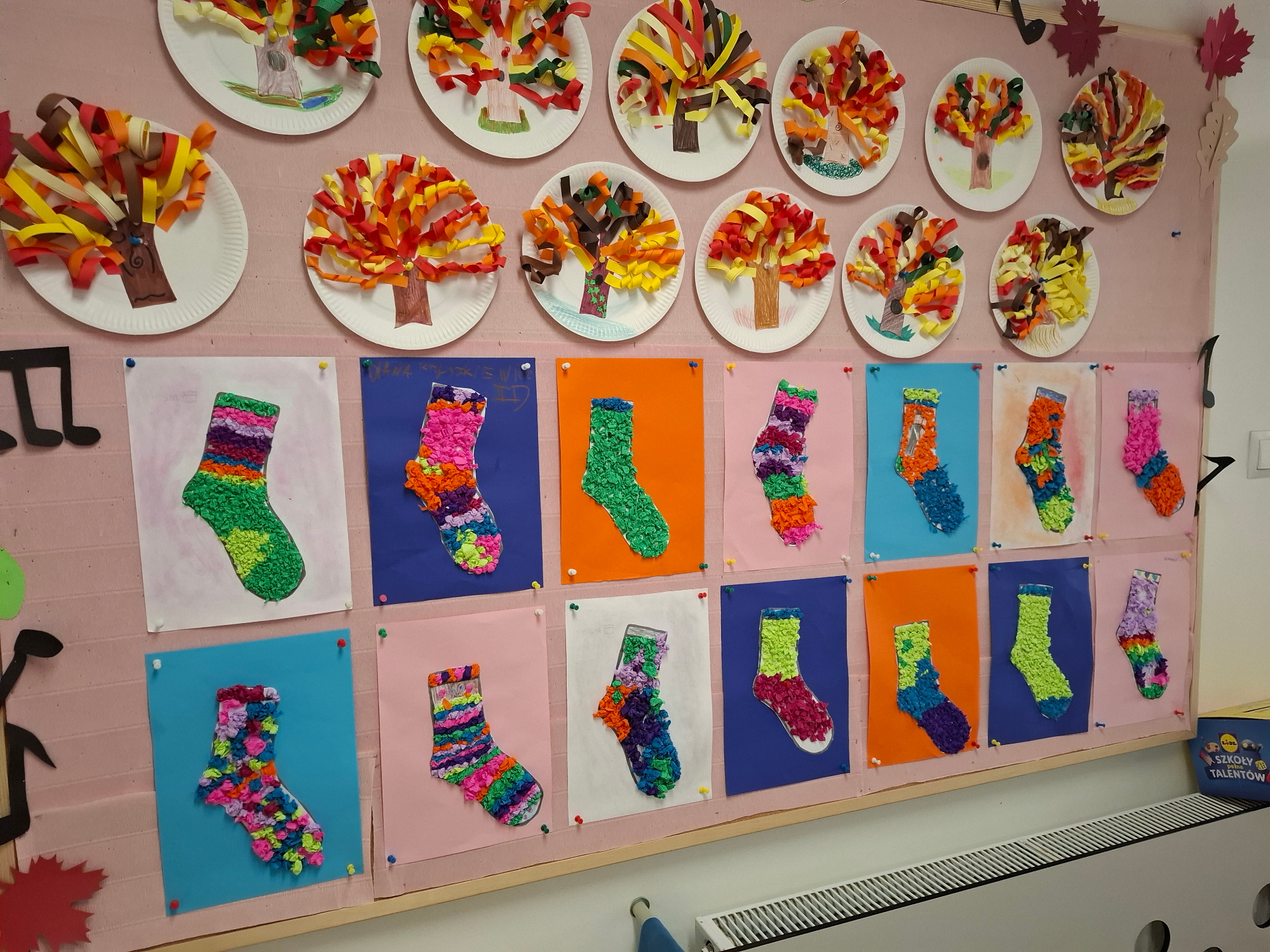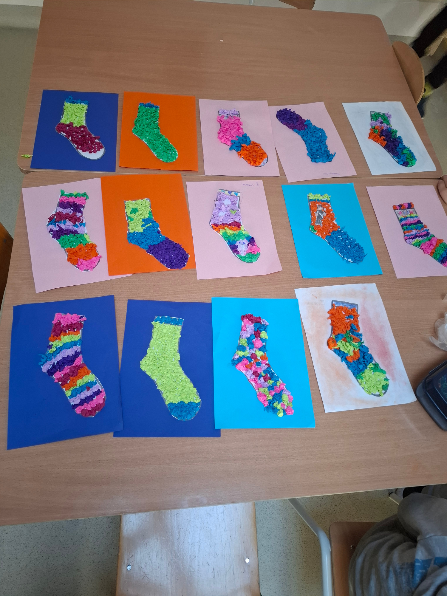 Po rozmowie przystąpiliśmy do pracy plastycznej – wydzieranki „Skarpetka”. Z kolorowych papierów dzieci tworzyły własne, niepowtarzalne skarpetki, ozdabiając je wzorami, kształtami i błyszczącymi elementami. Powstała cała kolekcja barwnych, wesołych prac, które ozdobiły naszą świetlicową gazetkę.