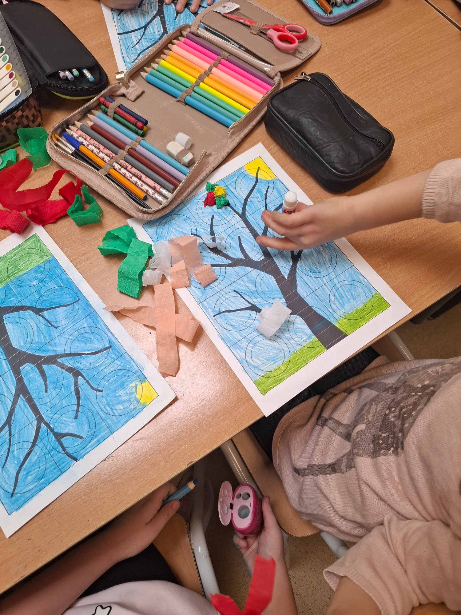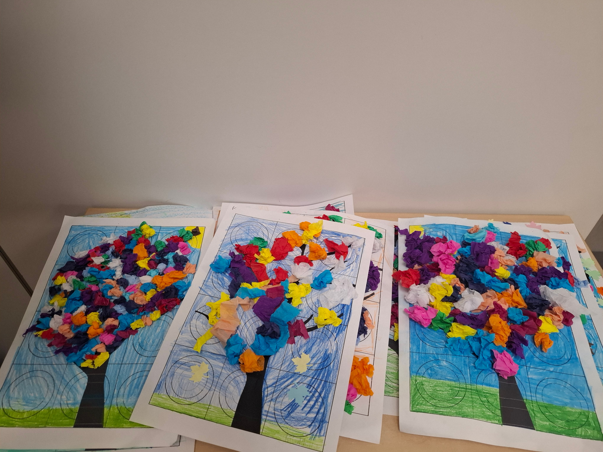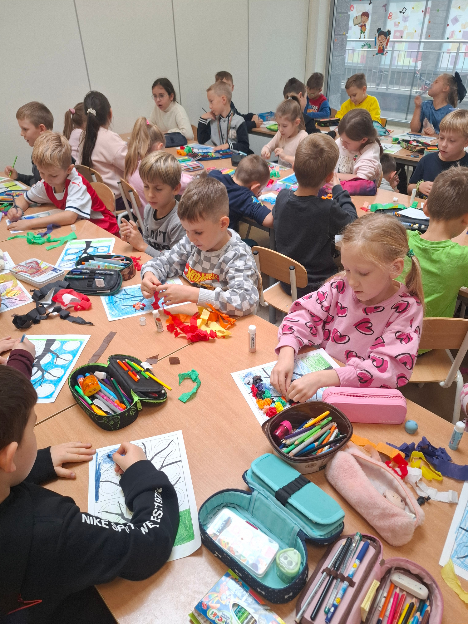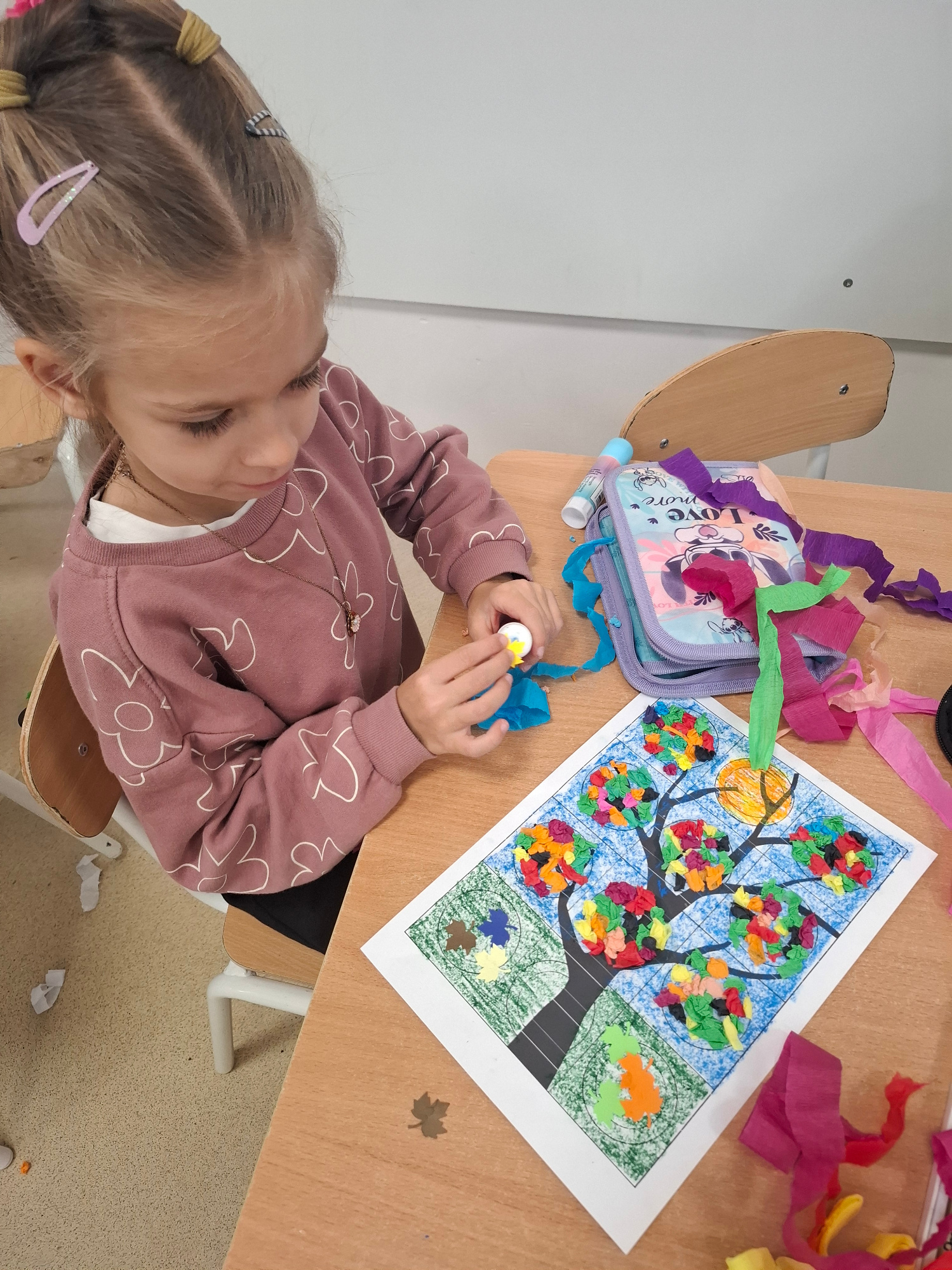 de dziecko otrzymało kartkę, na której wydrukowany był pień drzewa, a następnie – wykorzystując kolorową krepinę – formowało małe kulki, które naklejało jako liście. Kolory krepiny dobrane były w barwach jesieni: odcienie czerwieni, pomarańczy, żółci i zieleni pięknie oddawały klimat tej pory roku.