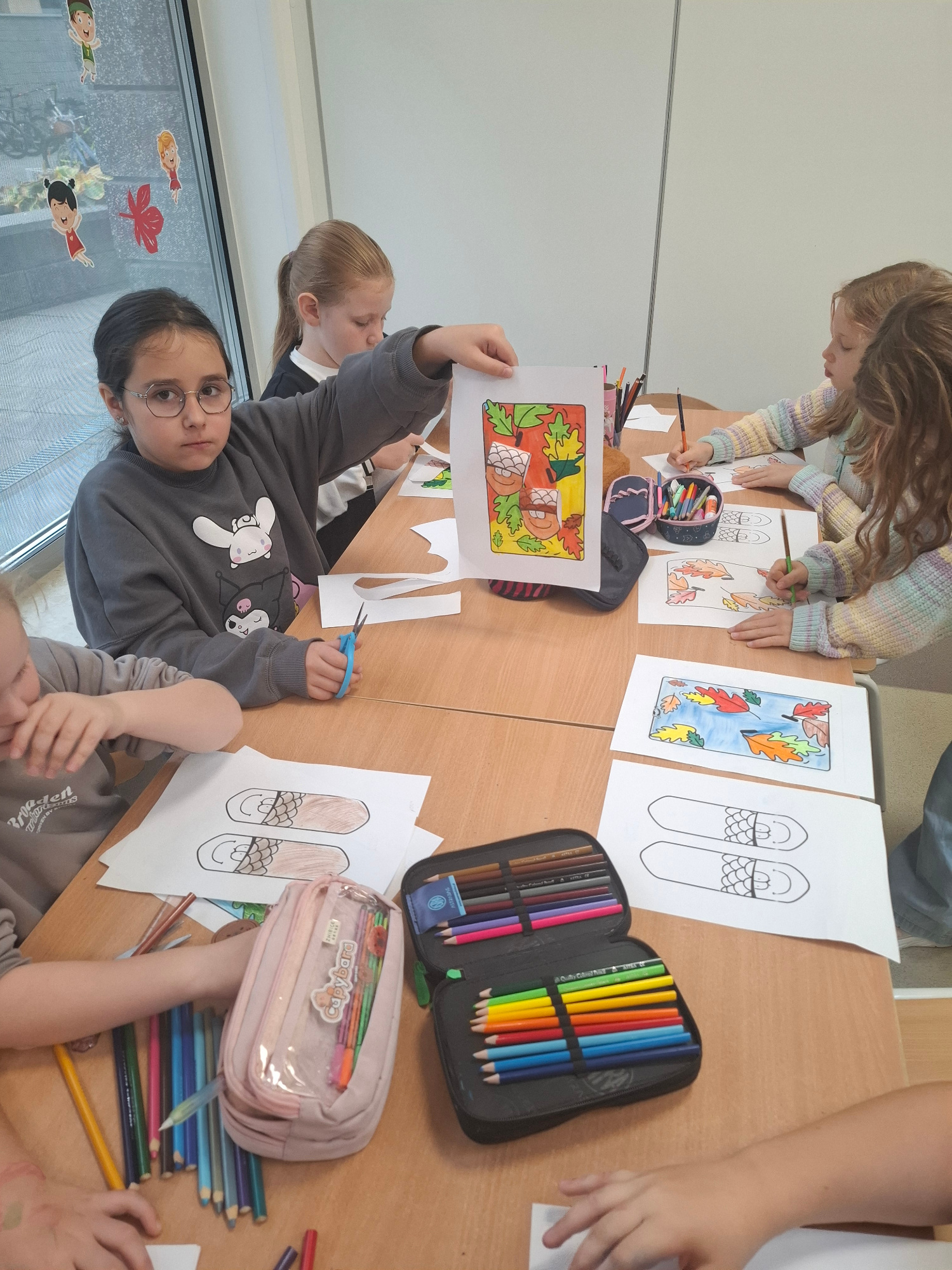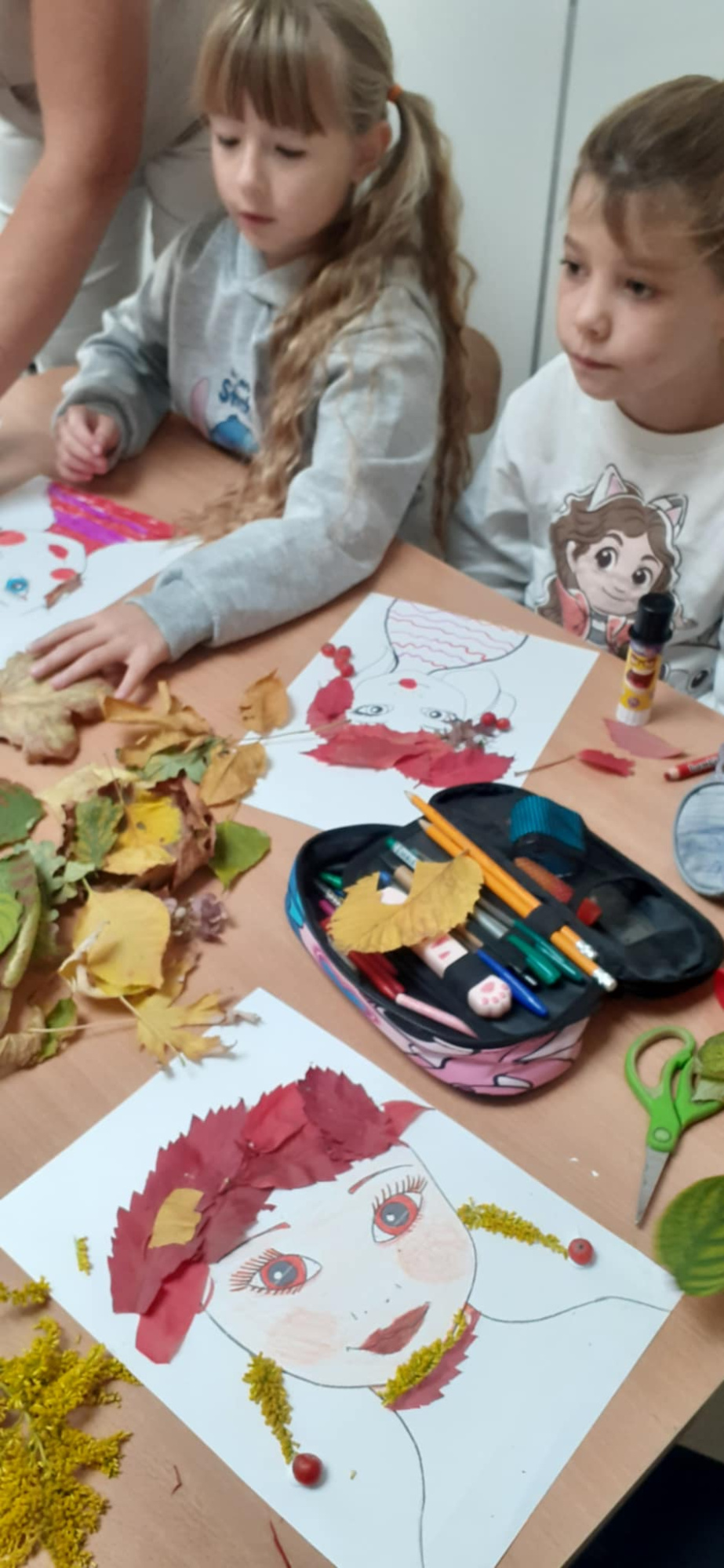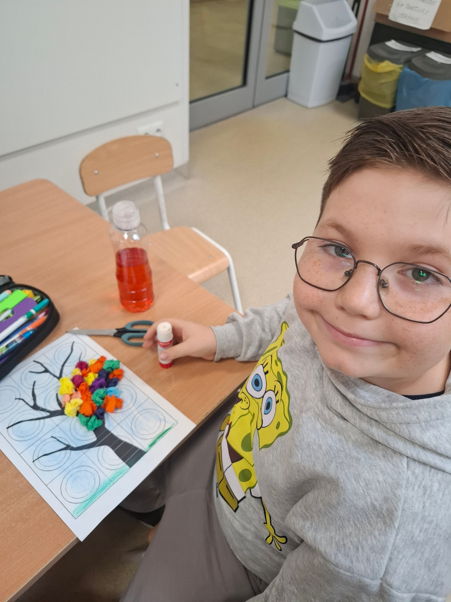 Podczas zajęć uczniowie rozwijali swoją kreatywność i zdolności manualne. Powstały piękne prace przedstawiające portrety Pani Jesieni. Atmosfera była bardzo twórcza i radosna – nie brakowało śmiechu, rozmów o zmianach w przyrodzie oraz wspólnego podziwiania gotowych dzieł.